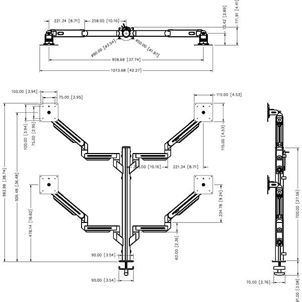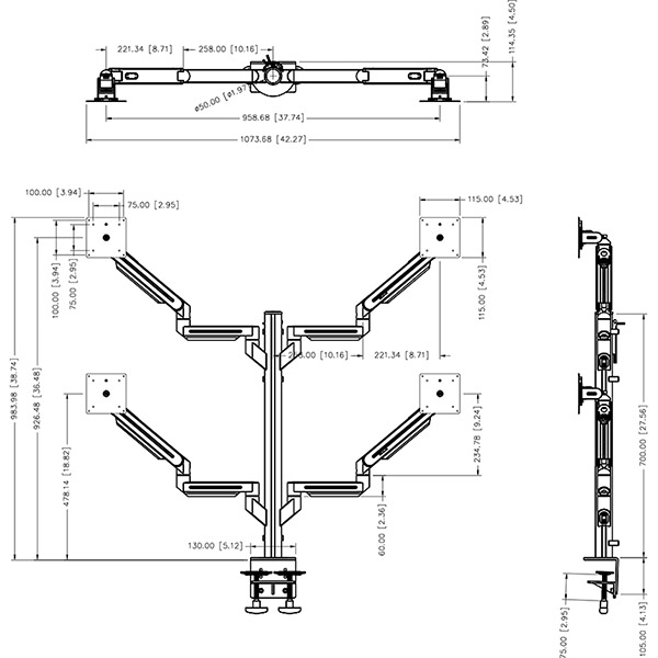 Dragonfly four monitor arms with 700mm post height is designed for clamp or grommet mount application and the loading range could be 1.5~8kg (3.3-17.6lbs). The avant-garde appearance and smooth line design, made of aluminum alloy makes it safer and stronger to use. Conform to ergonomic, you can easily adjust the screen to the most comfortable field of view. The quick release function can let you change the screen according to personal usage and environmental space. The monitor arm is equipped with cable management function, allowing you to hide the cables in the monitor arm, keeping the workspace tidy. Tool storage design concept is also one of its competitive advantages, considerate humanized design, do not have to worry about loss of tools. There is also optional anti-theft kit, which can be installed on the quick-release part to prevent the screen from being stolen and ensure property safety.