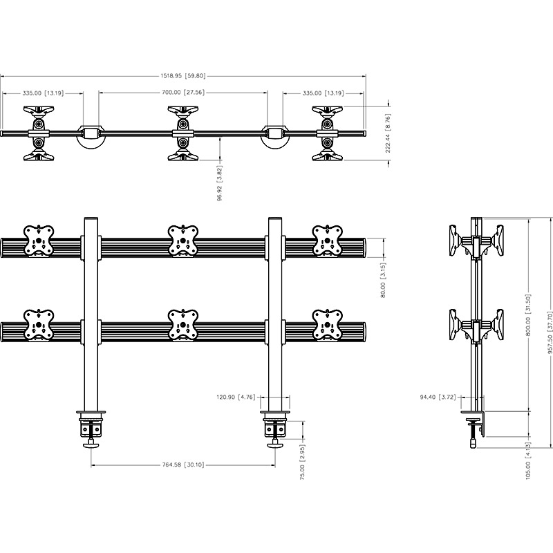 Tool Bar System (six monitors, one layer, back to back, swivel arm) is designed by clamp / grommet mounting and the MAX loading could be 12 Kgs (26.4 labs). Modular and multi-screen design saves space...
